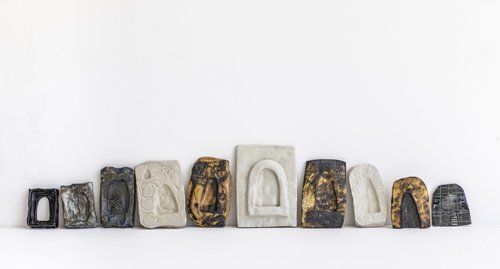The collection of ceramic alcoves of hand-built clay refer to contemplation. These recessed forms, some marked with fabric memories, others rebound with cord, offer modest spaces for reflection —where one state of mind or thought shifts to another. During the residency, I experimented with pressing different fibres into clay: jute, paper coil, yarn and rope. This tension between soft textile memory and hard clay permanence was a key area of material exploration.