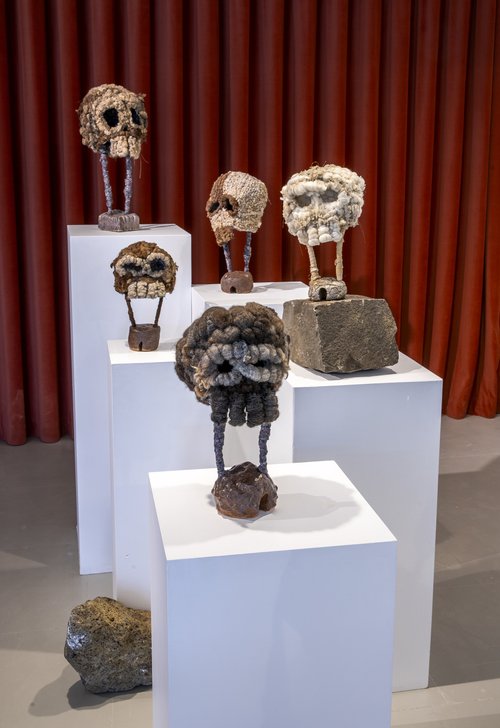 Felt and wool skulls and ceramic alcoves exploring deep-time, human experience, strife and reflection.