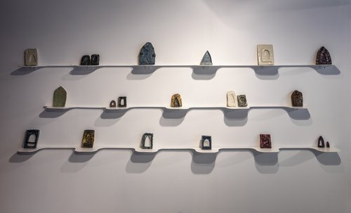 We can think about the "archetypal hut" as humanity's first dwelling, a space that exists between physical shelter and symbolic meaning.[3] These ceramic hovels echo this duality: they protect, by creating a foundation for the textile sculptures, while recalling early human shelters, pathways of evolution and personal journey.