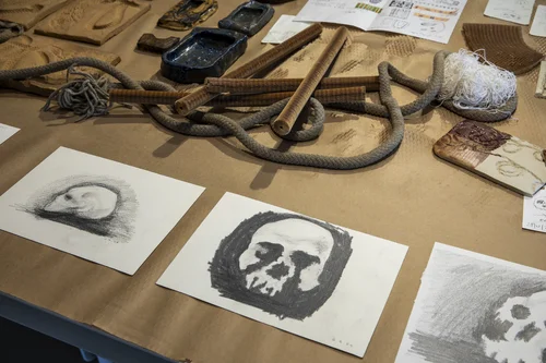 In Anthro-Ponder, I present five textile skulls mounted above clay huts, ceramic alcoves impressed with fabric memories, and the experimental tiles and drawings that shaped the development of these artworks. This residency gave me space to bring clay into my textile practice—a material evolution I am pleased to share in this exhibition.